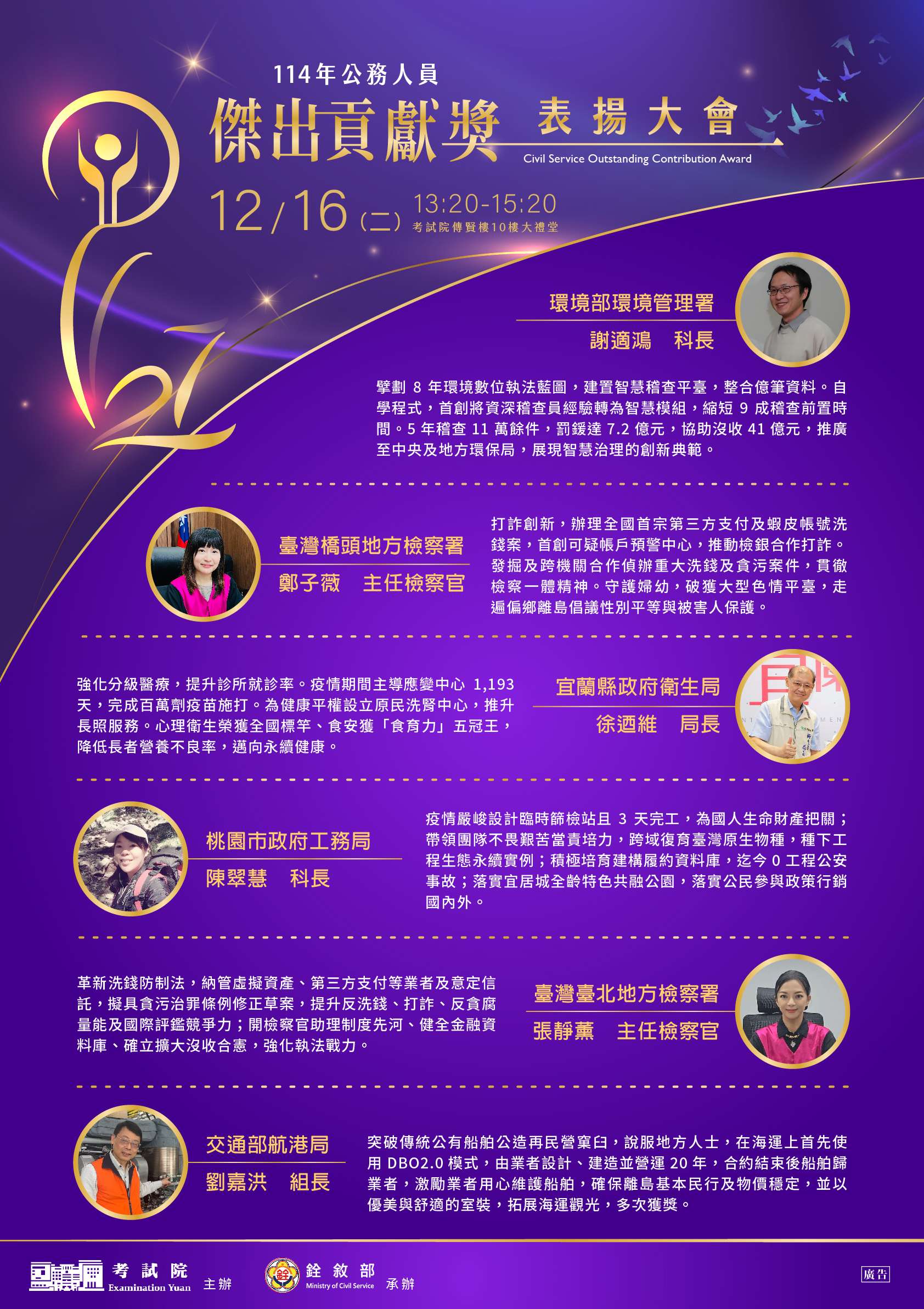 二、114年公務人員傑出貢獻獎業經考試院組成評審委員會評選出6名得獎人及6組得獎團體;考試院為表揚得獎者傑出事蹟,訂於114年12月16日(星期二)下午1時20分於該院傳賢樓10樓大禮堂舉行表揚大會。