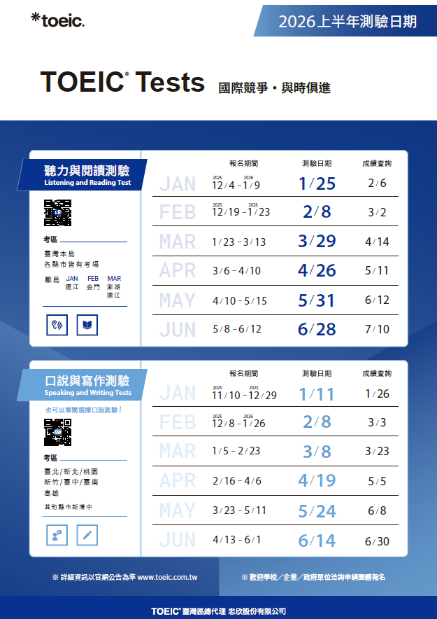 忠欣股份有限公司函送該公司2026上半年度TOEIC系列測驗之公開測驗日期公告資訊一案。
