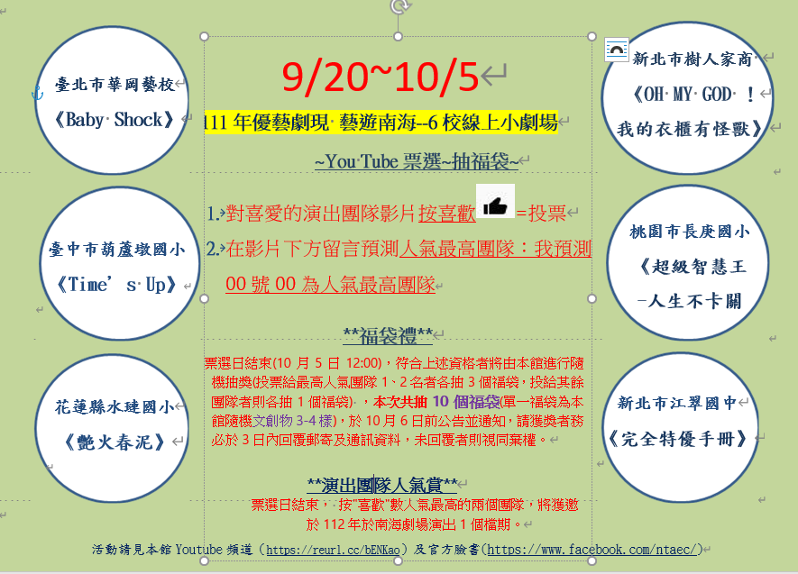 二、111年度表演藝術類競賽因嚴重特殊傳染性肺炎無法現場聆賞,國立臺灣藝術教育館(下稱藝教館)特地舉辦「優藝劇現」創意戲劇比賽網路小劇場推廣活動,邀請創意戲劇優秀團隊至該館南海劇場演出錄影,以網路播映方式,即日起至111年10月5日止在藝教館官方臉書連結YouTube頻道播出,歡迎民眾藉由線上平臺欣賞學生們創意優質戲劇。