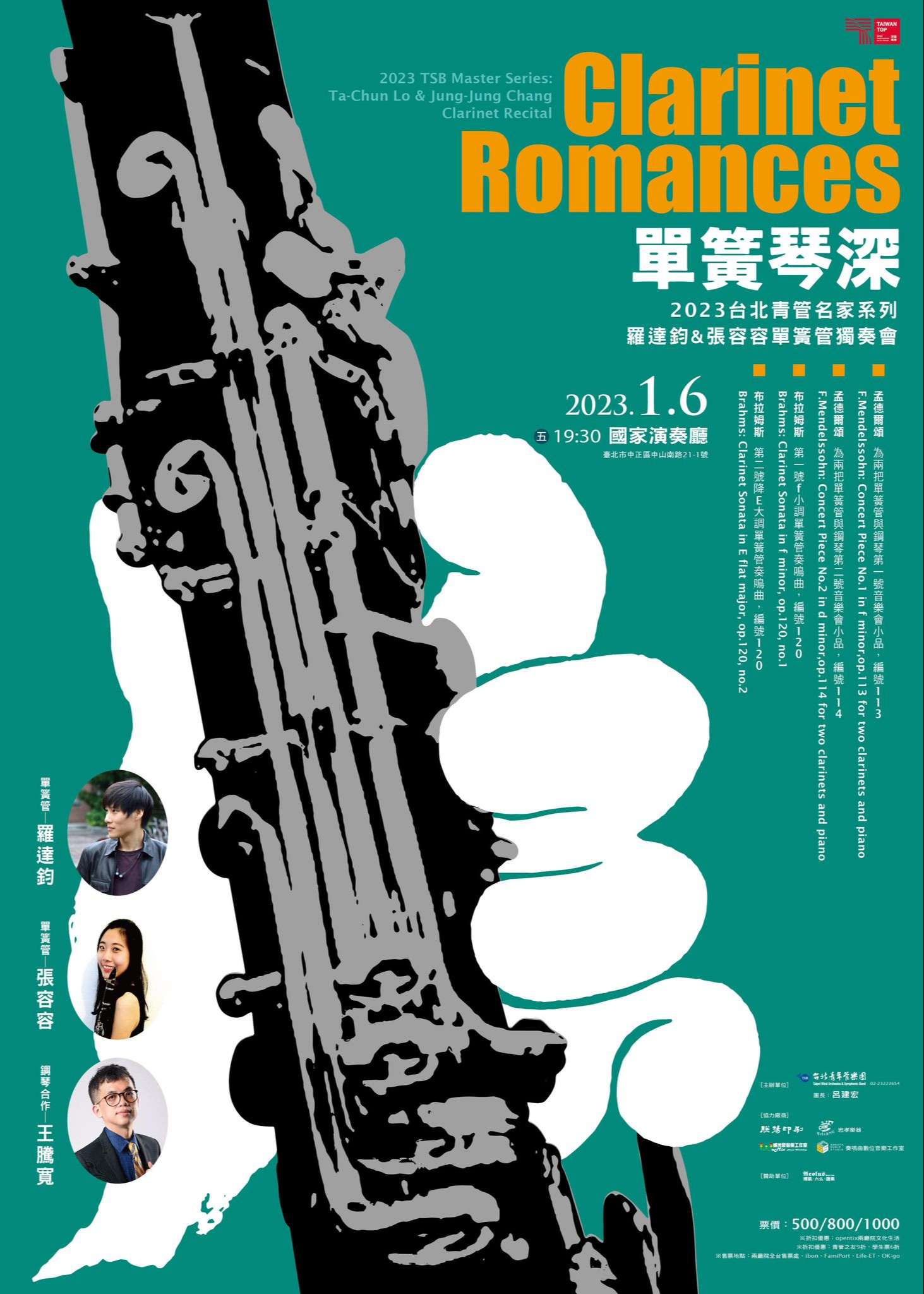 一、2023台北青管名家系列,邀請台北青管2團首席單簧管羅達鈞,與留法單簧管演奏家張容容擔綱獨奏,演奏布拉姆斯2首單簧管奏鳴曲、與孟德爾頌單簧管2重奏與鋼琴2首音樂會演奏曲,讓您深入認識單簧管音樂美好。