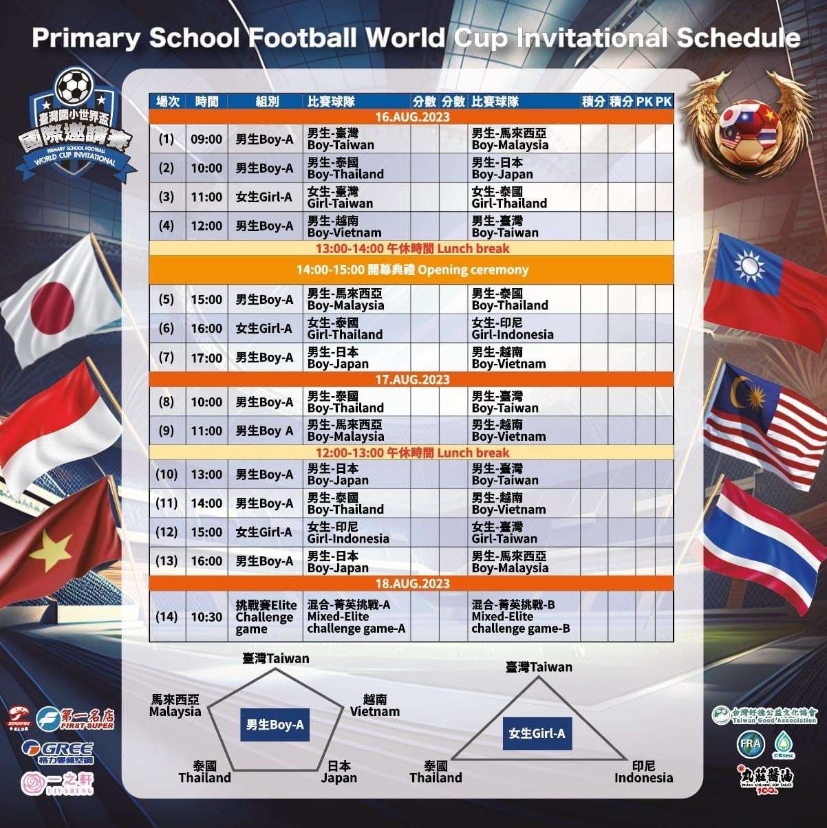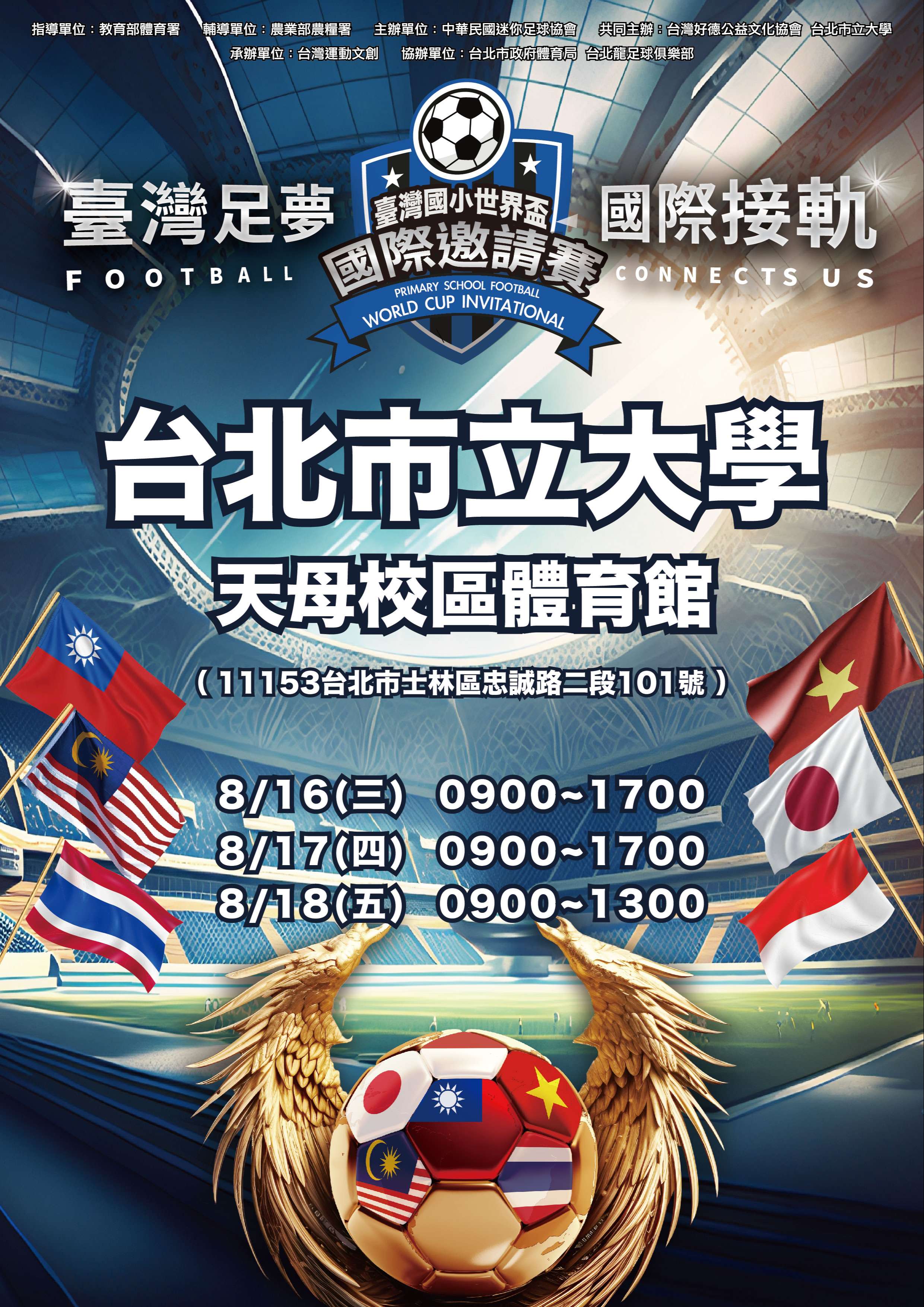 說明:為推展國民小學足球運動,提升國內國民小學足球水準與視野,與國際接軌增加臺灣足球國際能見度、增進國際友誼,社團法人中華民國迷你足球協會將於112年08月16日至112年08月18日假臺北市立大學天母校區體育館舉辦旨揭活動,宣傳海報及賽程圖如附件,歡迎各校一同來參與觀賽。