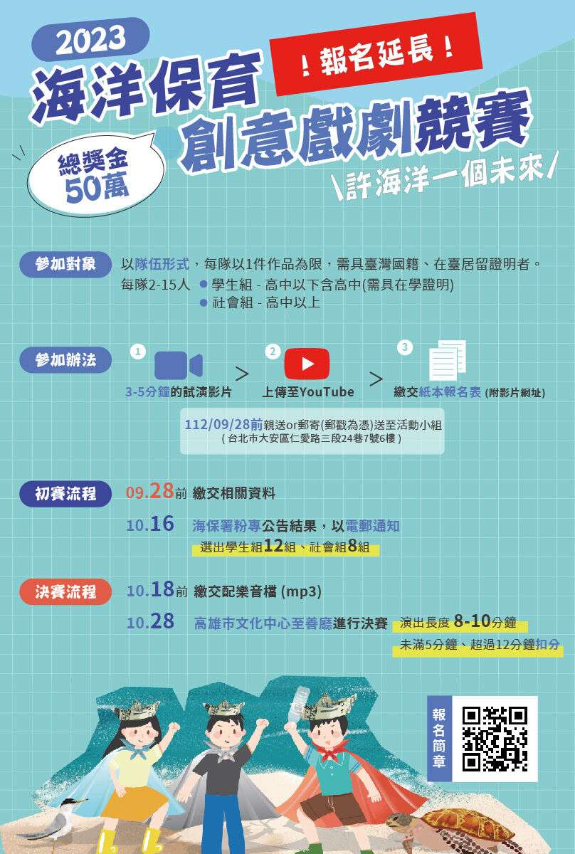 二、為擴大推廣海洋保育教育,該署112年度舉辦旨揭競賽活 動,並邀請教育部、文化部及農業部擔任指導單位,期望 透過不同領域國人共襄盛舉,發揮創意思維,以多元形式 演繹如何「許海洋一個未來」,歡迎組隊報名參加競賽。