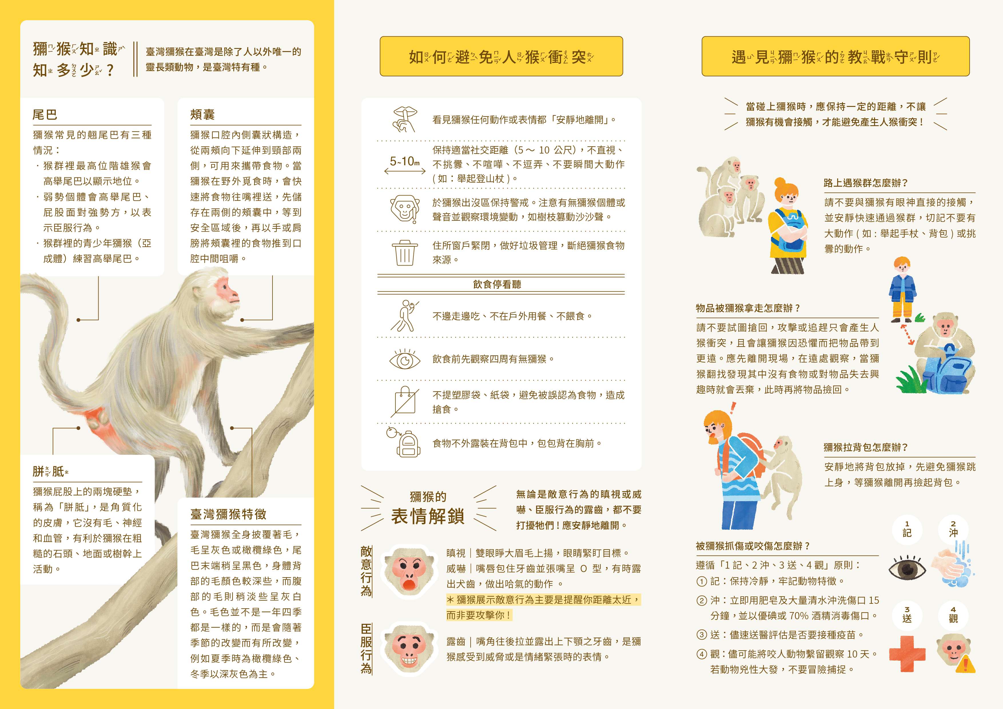二、另考量農業部林業及自然保育署與所屬分署、農業部生物 多樣性研究所、內政部國家公園署陽明山國家公園管理處與自然公園管理處、各縣市政府(不含離島縣市)、農民 與保育等團體,仍有在人猴衝突嚴重區域內進行宣導之需要,將提供摺頁紙本(另寄送)供分送所屬單位及轄內公、私立動物園擴大宣導。