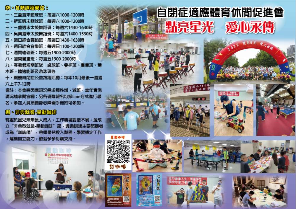 二、本會長期致力於自閉症者〈以下簡稱“星兒”〉各項體育〈籃球、桌球、水適能、舞蹈等〉及休閒〈藝術創作、音樂培養、手作工藝等〉等服務,期能提供星兒家庭專屬合適的學習環境,不斷成長〈簡介單張如附件一〉。