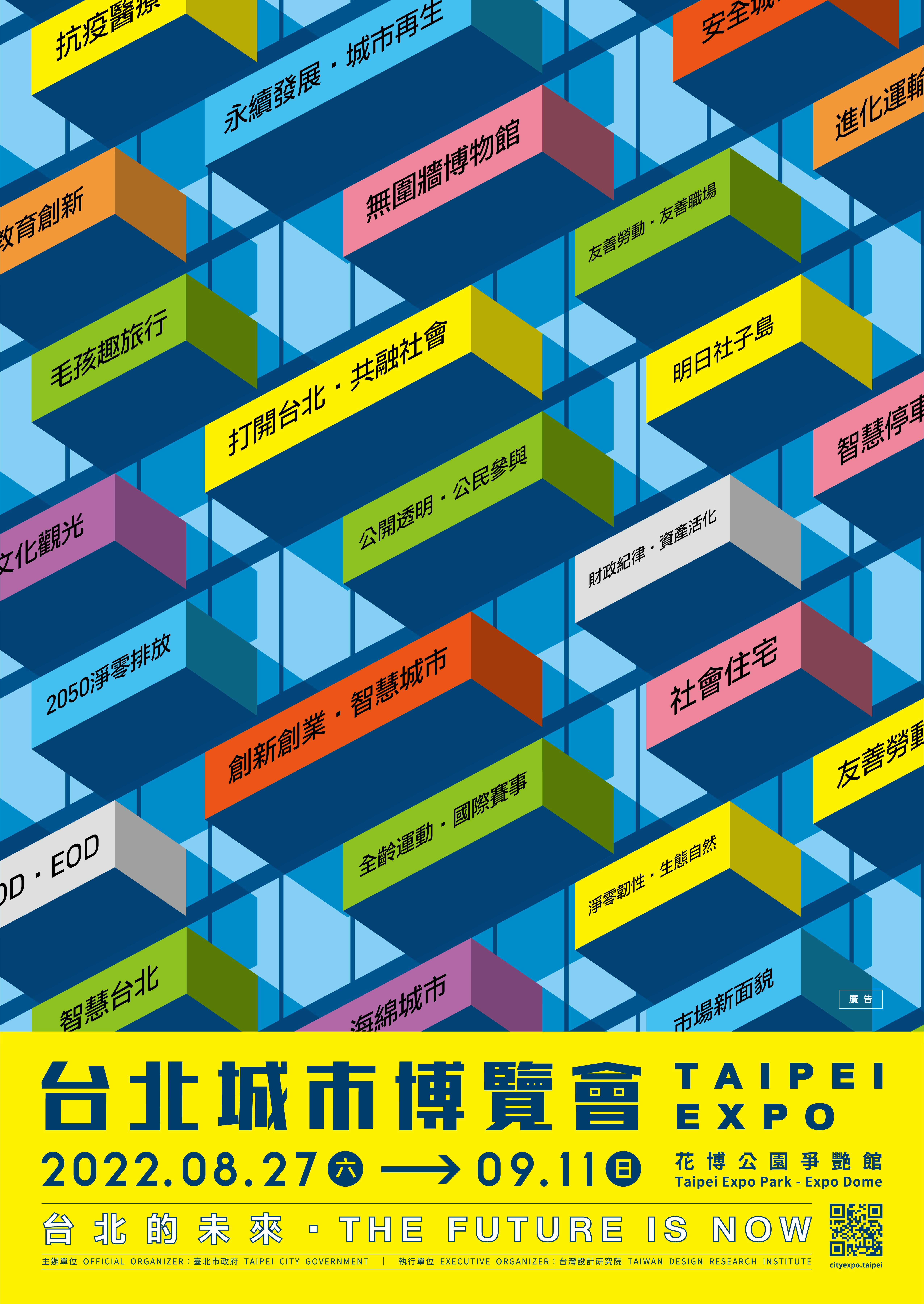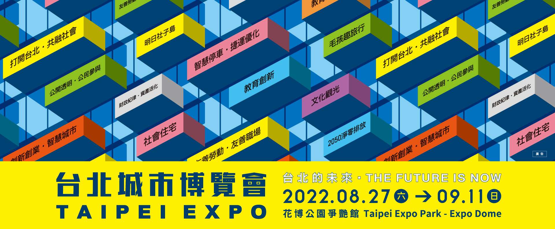 二、2022 台北城博會於8/27-9/30以線上線下爭艷館混合展出,以「台北的未來」為主軸,透過 「永續發展」、「城市再生」、「打開台北」、「共融 社會」、「創新創業」、「智慧城市」六大主題展現 未來台北新風貌。