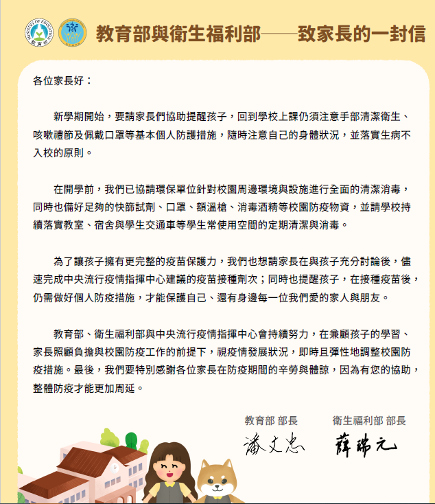 轉知教育部與衛生福利署致家長的一封信