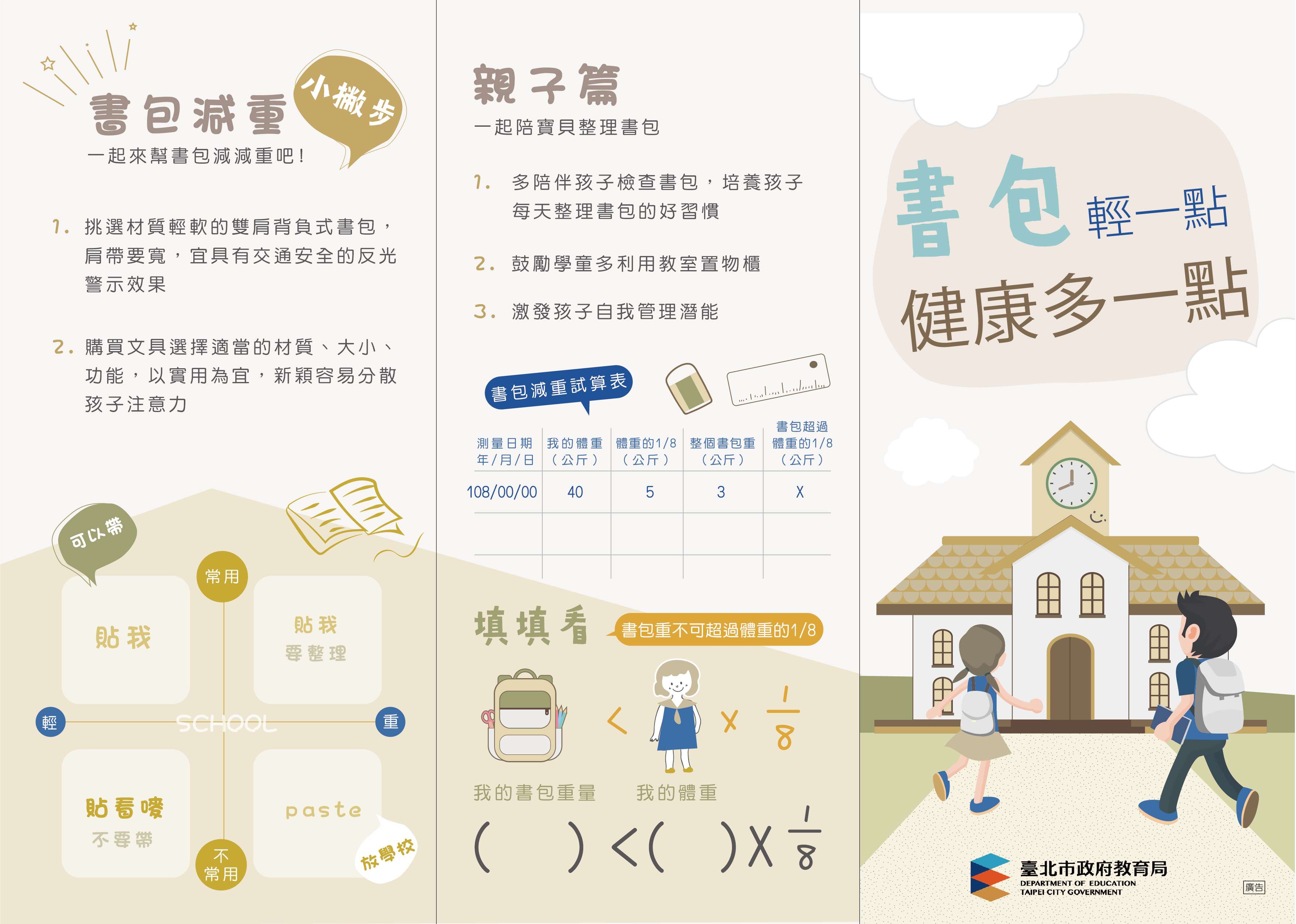 二、為協助學童選購、檢查及整理書包,以共同落實書包減 重理念,本局特編製「書包減重宣導摺頁」。