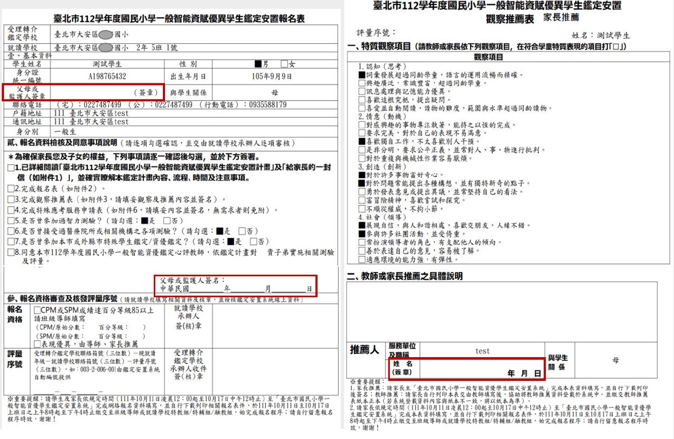 ☆ 請留意家長列印出來的文件,有「同意書」+「觀察推薦表(家長推薦)」,若出現多列印出來一張「觀察推薦表(教師推薦)」請不予理會。並確認三處家長簽名(如下圖所示)再繳交給導師。