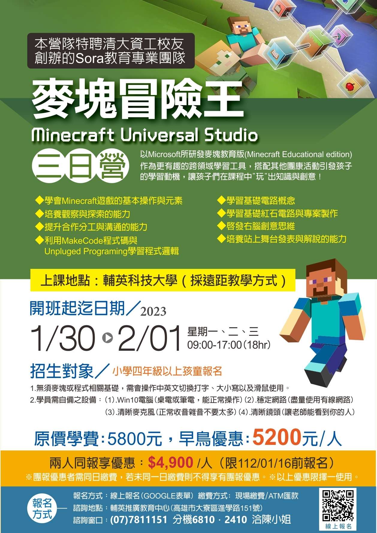 二、小學4年級以上孩童報名,無須麥塊或程式相關基礎,需會操作中英文切換打字、大小寫以及滑鼠使用。