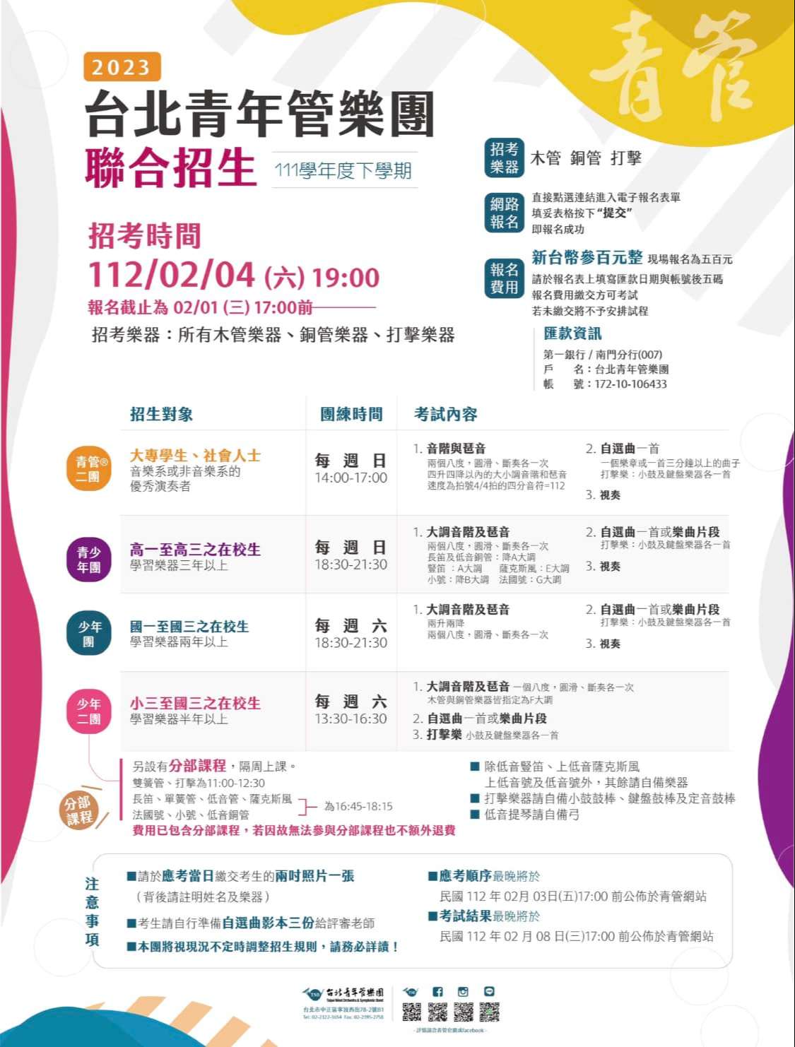 (四)相關招生資訊請至台北青年管樂團臉書粉絲專頁查詢(https://www. facebook.com/tsbgroup/)。