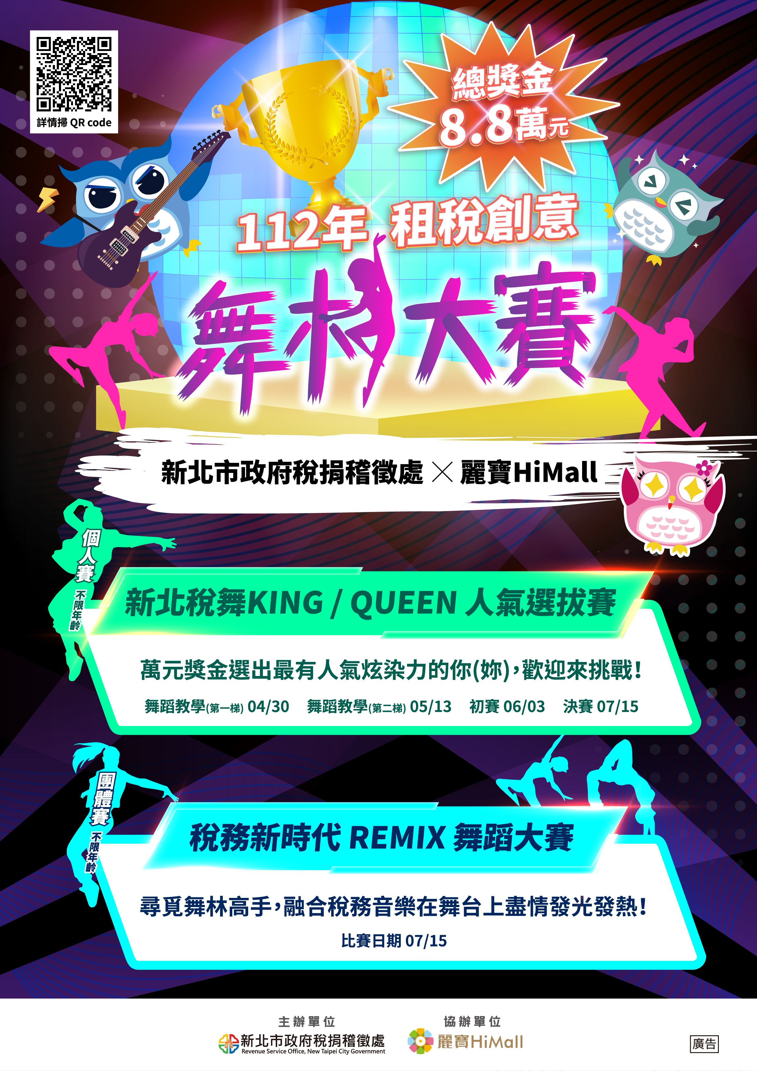 (一)個人組-「新北稅舞King、新北稅舞Queen人氣選拔賽」:舉辦2場舞蹈教學、初賽及決賽,評選出新北稅舞 King、Queen各1名,分別頒發獎金1萬元。