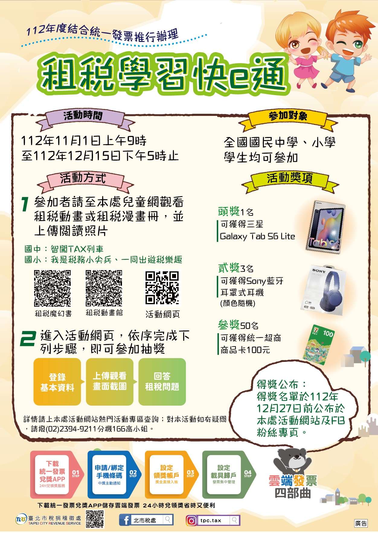 (二)活動內容:國中、國小學生於活動期間至「臺北市稅捐稽徵處兒童網」觀看租稅教育動畫或漫畫,將閱讀情形拍照上傳活動網頁,並正確回答租稅問題,就有機會獲三星Galaxy TabS6 Lite、Sony藍牙耳罩式耳機及統一超商商品卡100元等多項好禮!