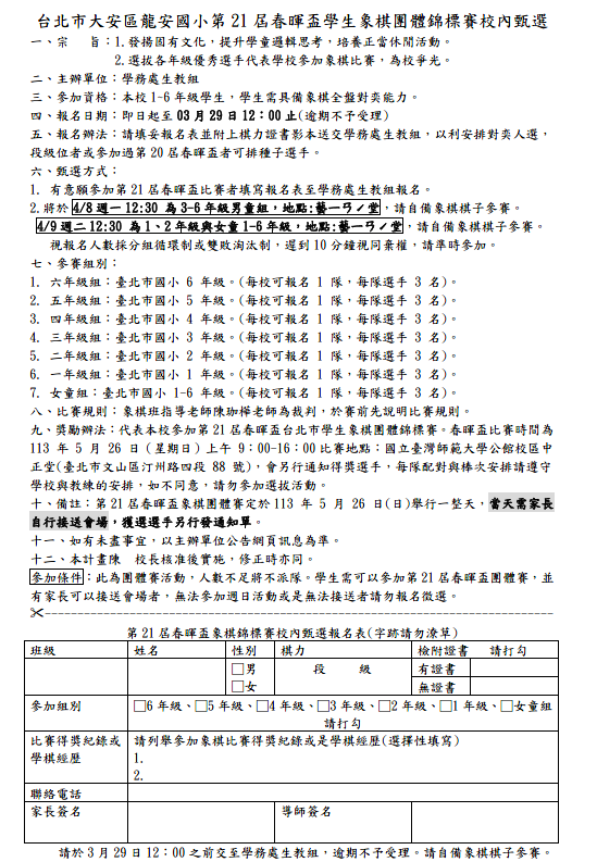 台北市大安區龍安國小第21屆春暉盃學生象棋團體錦標賽校內甄選