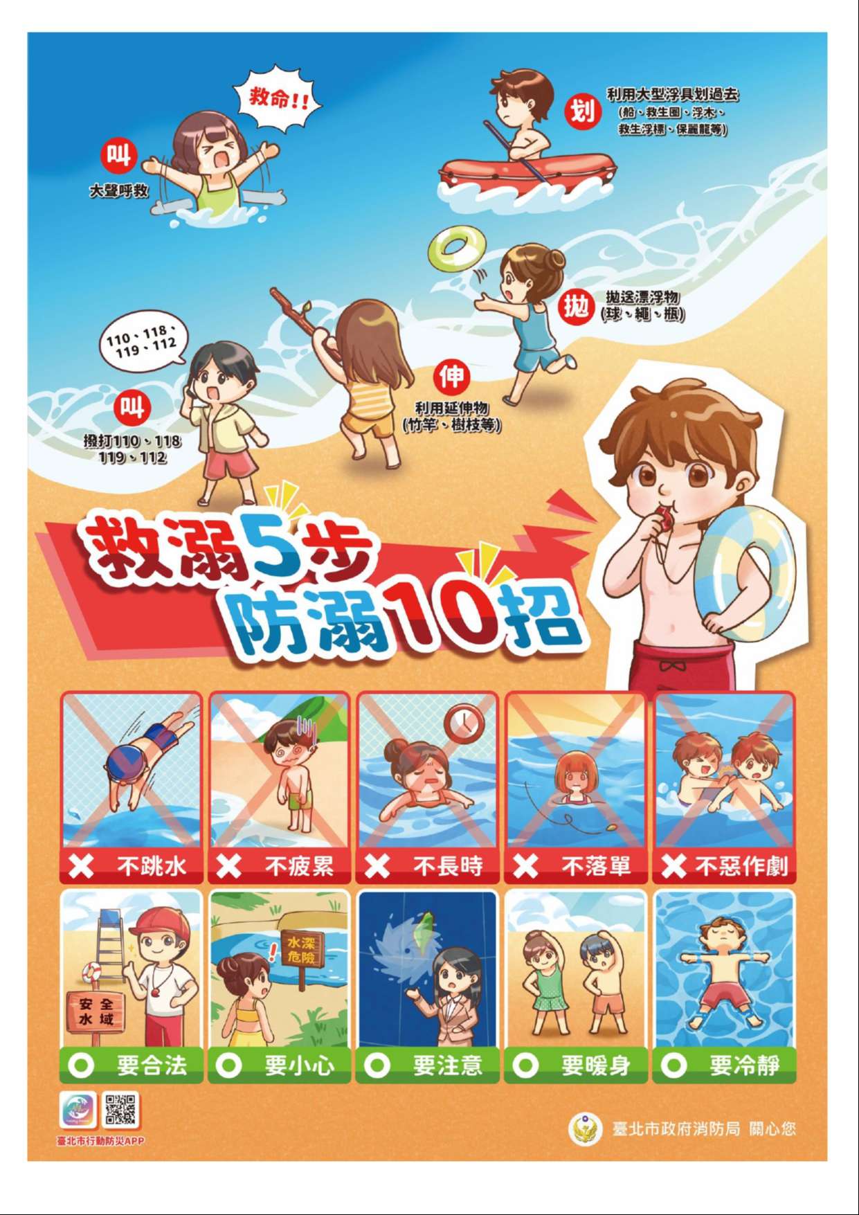 二、請參閱附件之救溺5步及防溺10招宣導海報。