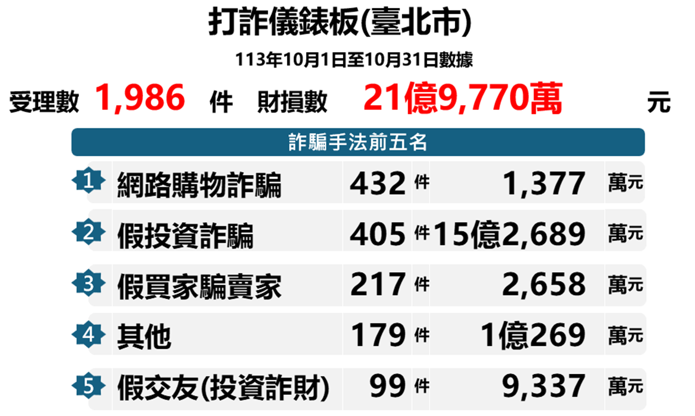 二、分析本市113年10月各類詐欺案件發生數共計1,986件,前