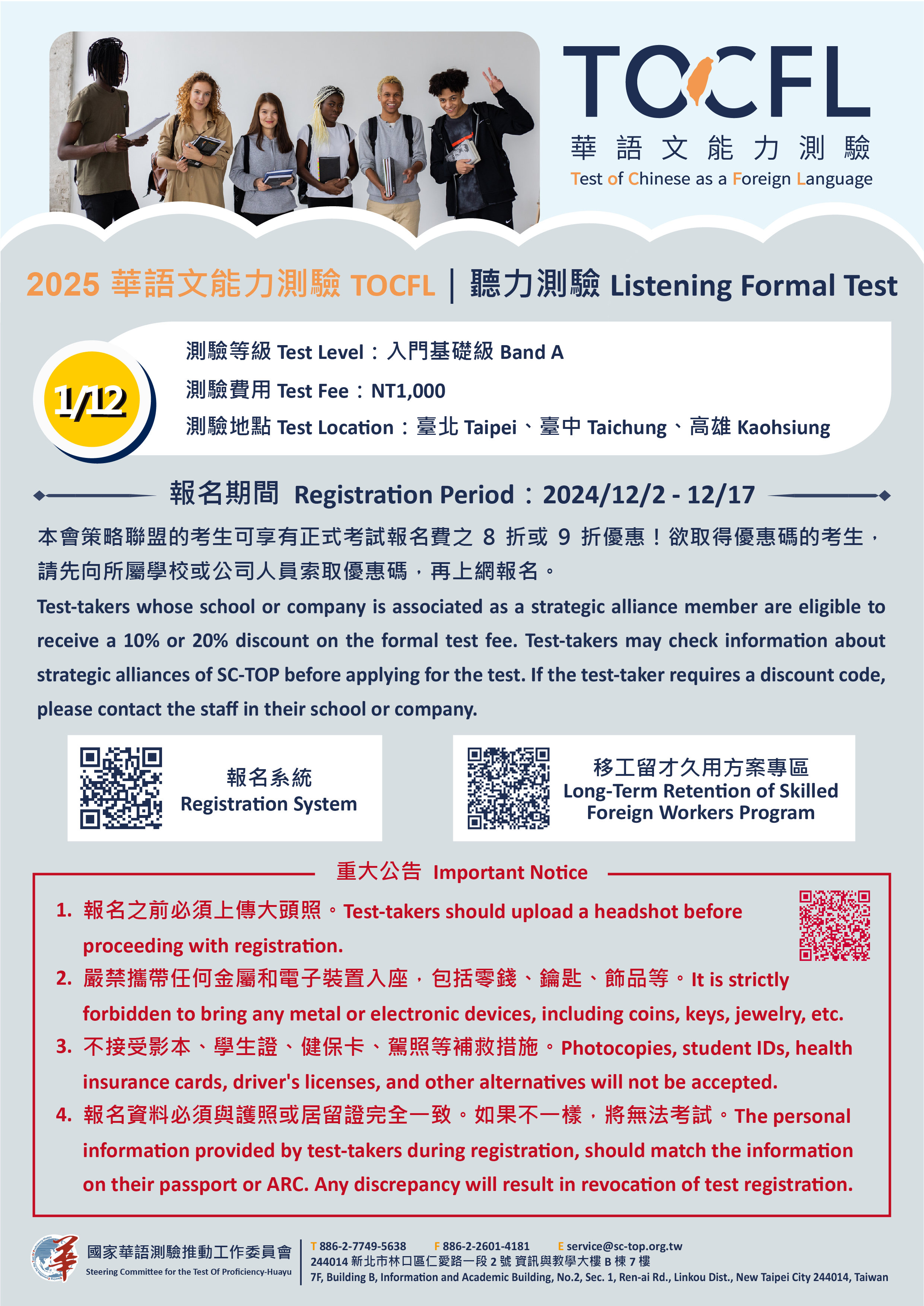 八、團體報名:以校為單位,考生人數超過30位可申請,詳情請見官網:https://tocfl.edu.tw/tocfl/index.php/sign_up/tw/list/1