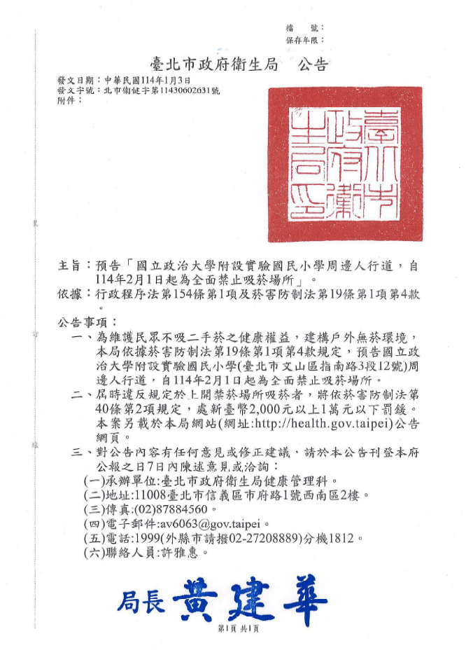 邊人行道,自114年2月1日起為全面禁止吸菸場所。
