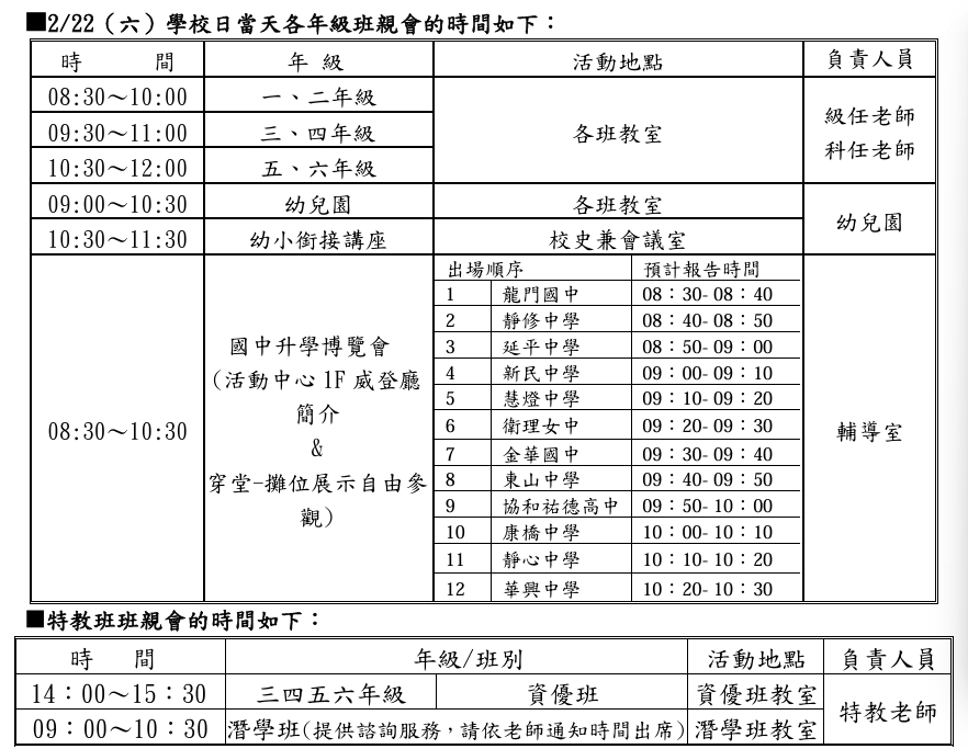 龍安國小113年度各處室聯繫事項及113-2學校日各班老師報告事項