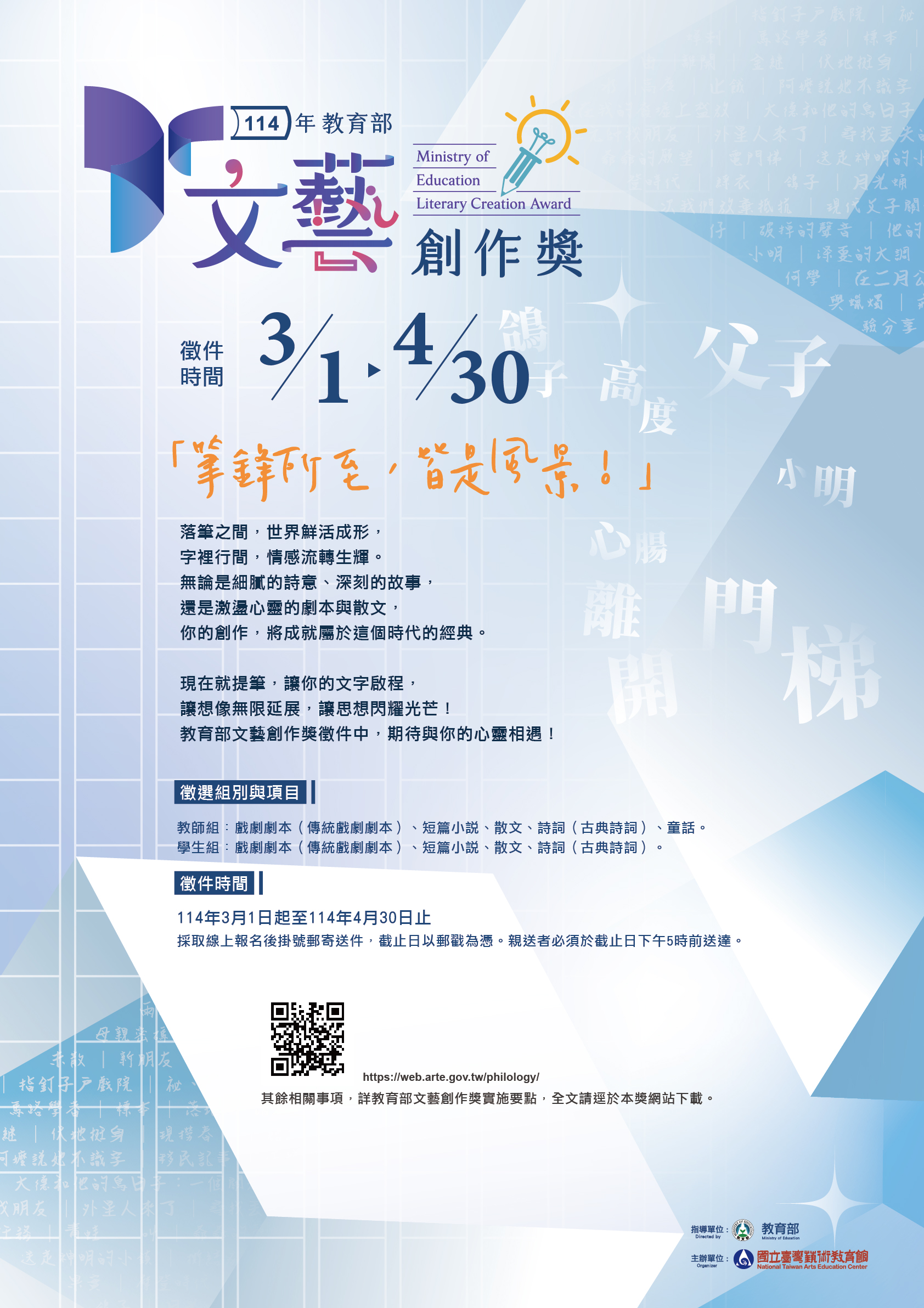 六、參選受理期間:自114年3月1日起至114年4月30日截止,採取先線上報名(網址:https://web.arte.gov.tw/philology/),後以掛號郵寄送件方式辦理,截止日以郵戳為憑;親送者必須於截止日下午5時前送達。