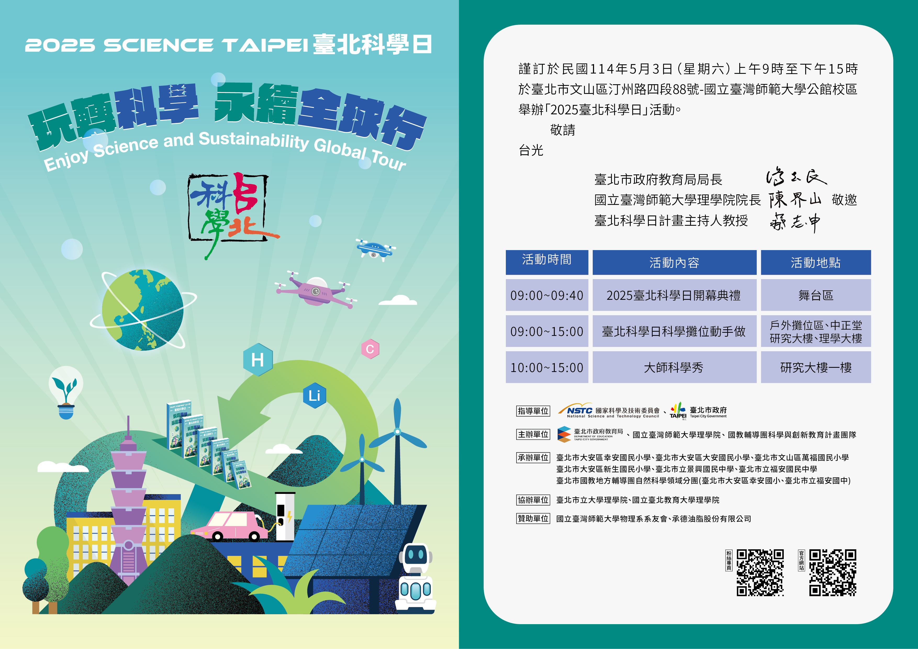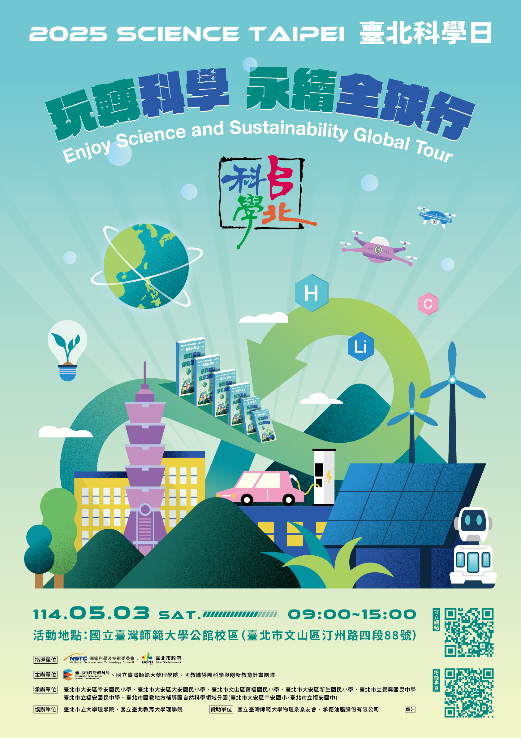 二、旨案係由本局與國立臺灣師範大學理學院物理學系合作舉辦,本年度將於114年5月3日(星期六)假師大公館校區辦理科學體驗實作活動,並響應聯合國教育科學及文化組織 「永續發展國際十年(IDSSD)」理念,藉本活動「玩轉科學-永續全球行」之主題,彰顯本市對於推動科學教育的重視。