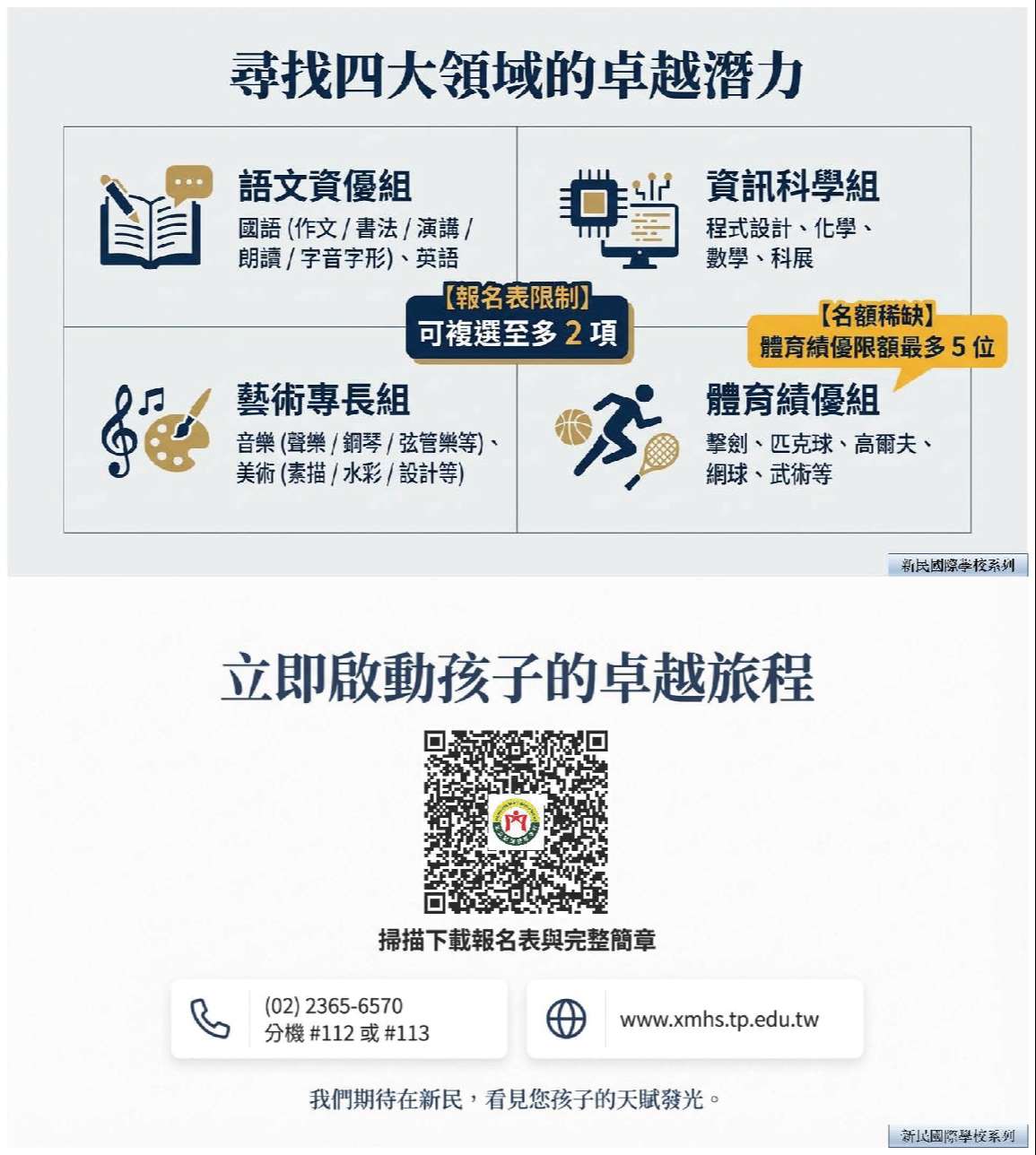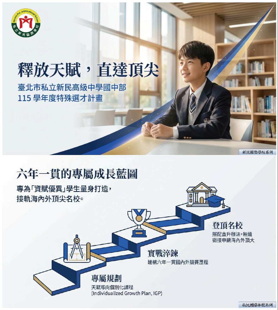 一、目的:專為特定領域「資賦優異」孩子,依據個別化的需求,量身打造六年一貫天賦導向個別化課程 (Individualized GrowthPlan, IGP),並搭配本校直升辦法,專注延續發展既有天賦,建構六年一貫國際/國內競賽歷程,銜接申請海內外頂大名校。